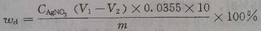 (1)称取试样500g,装入带塞磨口瓶中,用容量瓶取500ml蒸馏水,注入磨口瓶内,加上塞子,摇动一次,放置2h,然后每隔5min摇动一次,共摇动3次,使氯盐充分溶解。将磨口瓶上部已澄清的溶液过滤,然后用移液管吸取50ml滤液,注入三角瓶中,再加入浓度为5%铬酸钾指示剂1ml,用0.01mol/L硝酸银标准溶液滴定至呈现砖红色为终点,记录消耗的硝酸银标准溶液的毫升数(V1)。