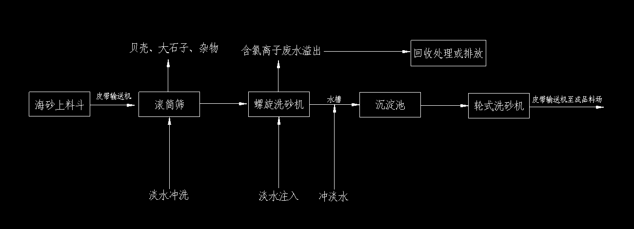 由图可见,淡化海砂生产加工可操作性强、工艺简单,先是滚筒筛的筛分处理(同时淡水冲洗),然后经过螺旋洗砂机进入沉淀池,后由轮式洗砂机淘洗脱水后输送至成品料场。