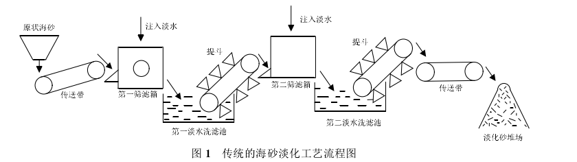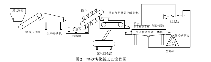 海砂淡化用淡水冲洗法是为常用的方法。可是这种方法需要反复多次用淡水进行冲洗,生产合乎建筑标准的淡化海砂对于淡水资源需求量很大,生产成本较大,在淡水资源缺乏的地区,这种传统的海沙淡化工艺就存在了很大的局限性。针对传统海砂淡化方法和工艺存在的问题,日前有国内学者研究通过采用对海沙中含有的氯盐进行氧化去除”处理新方法对海砂进行淡化处理,直接采用高效的脱氯剂把氯离子除去,大大减少了淡水的消耗量,可很大程度上节约淡水资源。经过试验得知除氯效果要远远好于传统海沙淡化方式--机械淘洗法。